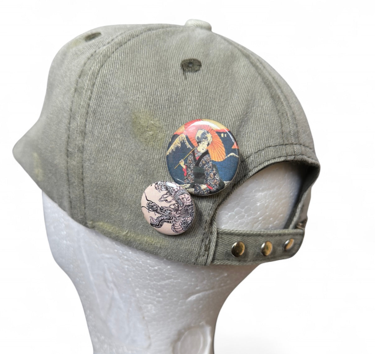 - True 1/1 baseball hat with unique distressing and hand placed studs/buttonsÂ